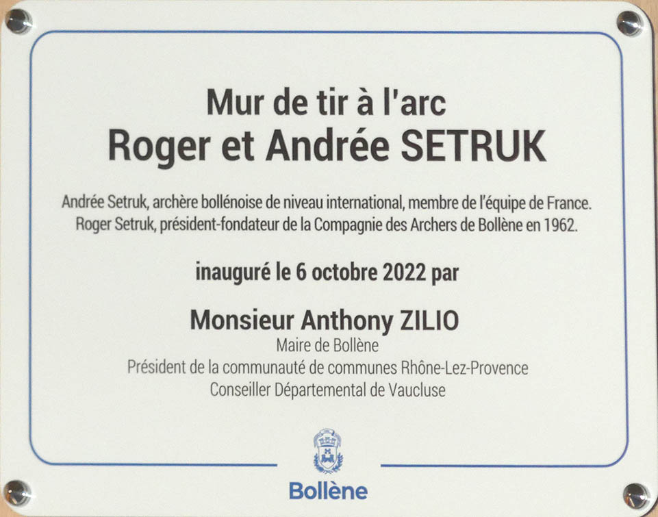 La Ville a proposé l'apposition d'une plaque commémorative portant le nom de Roger et Andrée Setruk, fondateurs des Archers Bollénois en 1962. La proposition honorifique a d'autant plus été acceptée par le club qu'elle coïncide avec son 60ème anniversaire. D'où une cordiale inauguration autour du président Alain Fèbre et plusieurs membres du club, en présence d'André Vigli et Christian Auzias, adjoints au maire Anthony Zilio, excusé.
